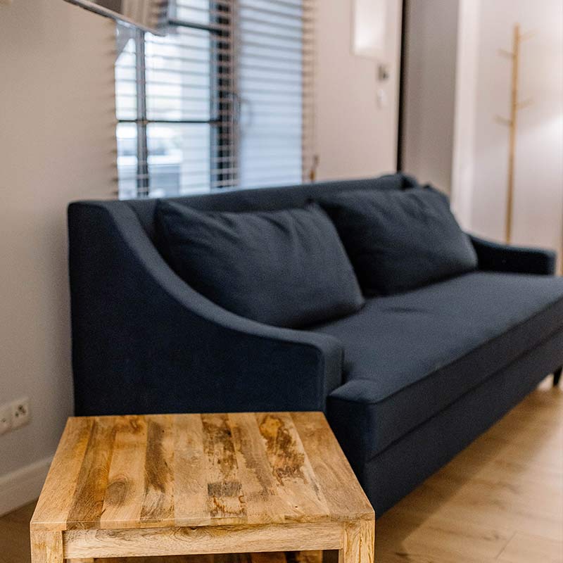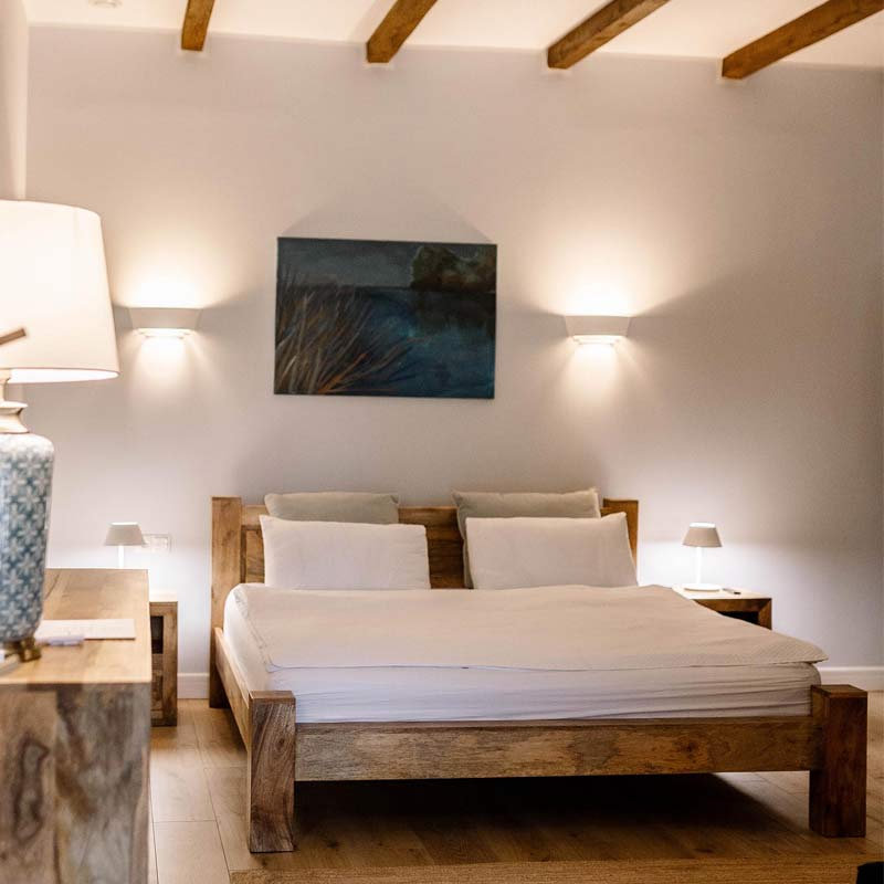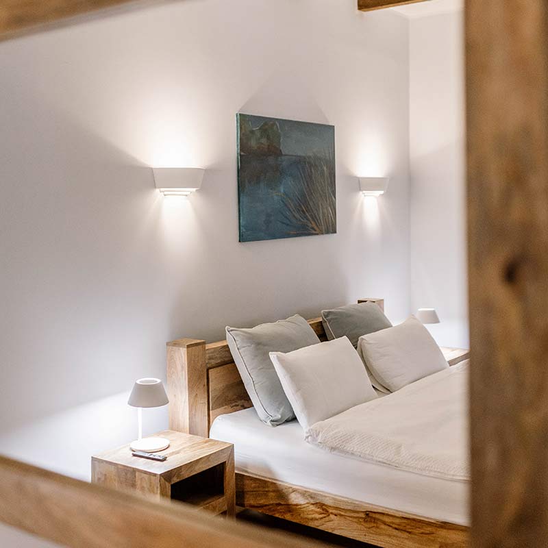 Wnętrze zachwyca harmonią naturalnego drewna i stonowanych kolorów. W sypialni – wygodne łóżko z obrazem inspirowanym jeziornymi krajobrazami. Przytulna strefa wypoczynkowa z sofą i miękkim oświetleniem tworzy atmosferę relaksu.
