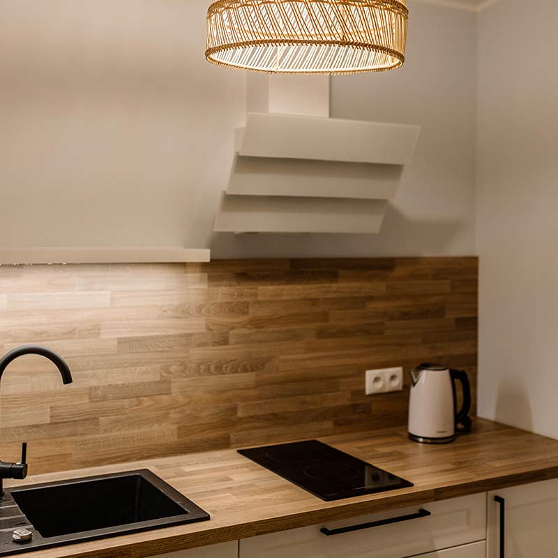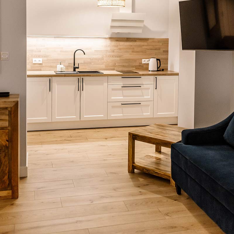 Apartament Mazurska Głębia – przytulna elegancja w rytmie mazurskiego spokoju. Jedyny apartament z w pełni wyposażoną kuchnią, idealny na domowe posiłki podczas wypoczynku.