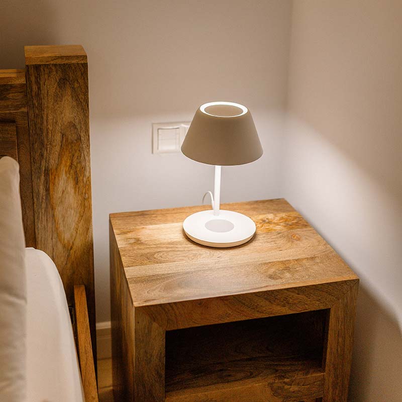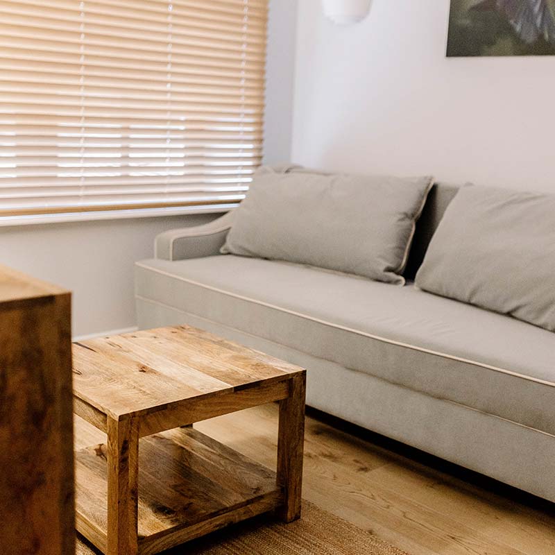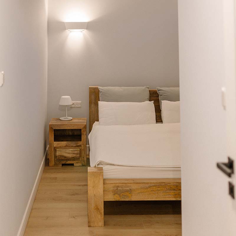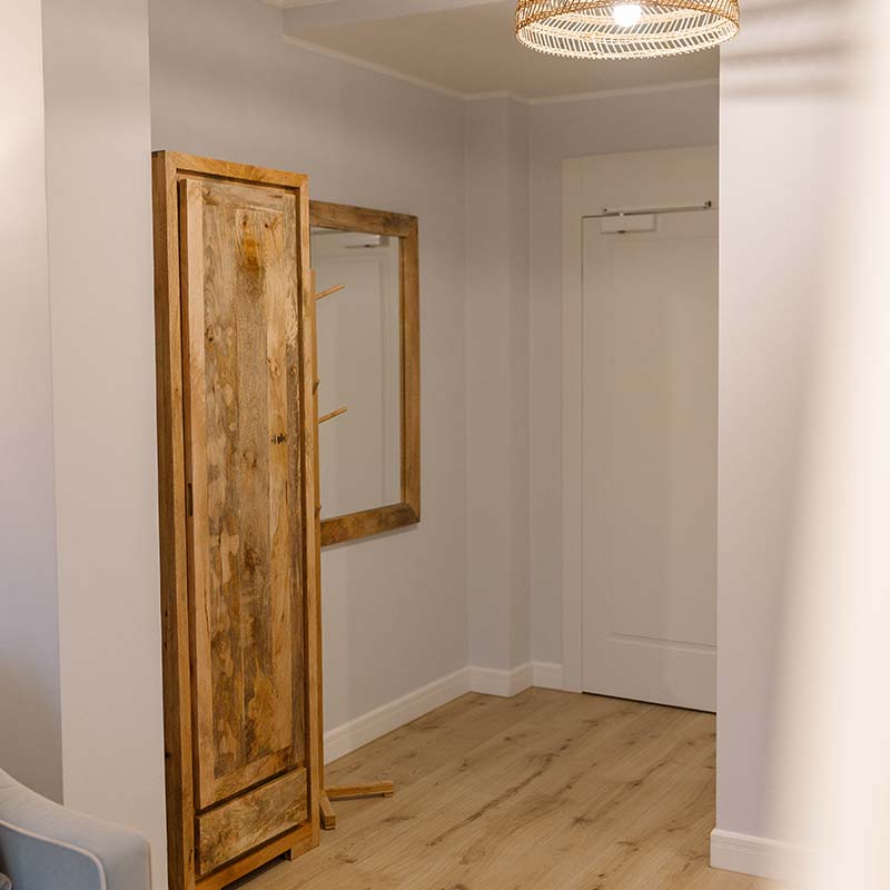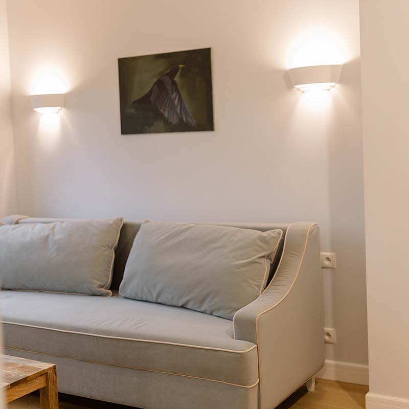 Wnętrze zachwyca stonowaną paletą barw, naturalnymi materiałami i błękitnymi akcentami. W sypialni – wygodne łóżko z inspirowanym naturą obrazem, który nadaje apartamentowi niepowtarzalny charakter i nazwę.
