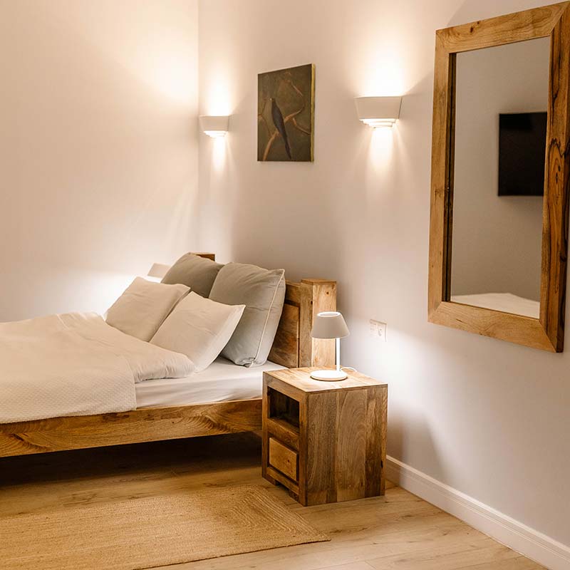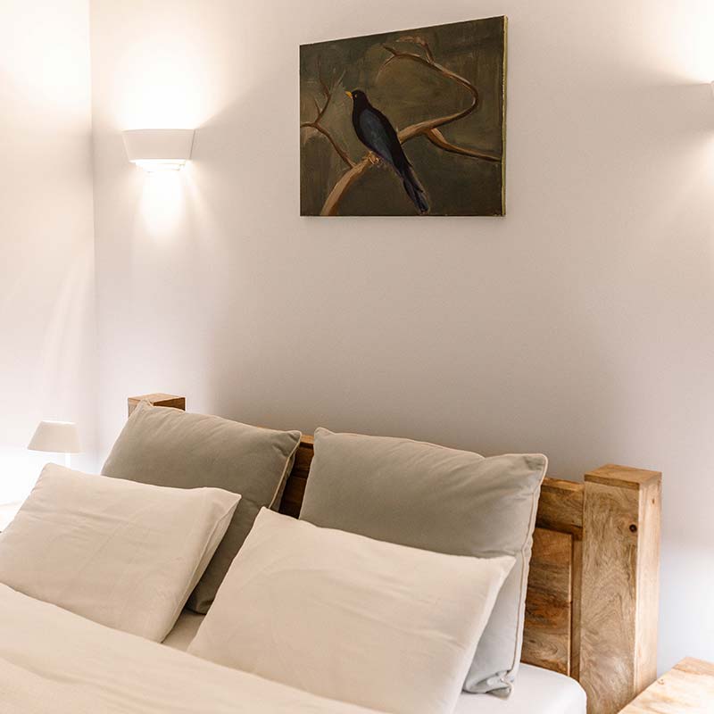 Wnętrze zachwyca połączeniem naturalnego drewna, jasnych barw i miękkiego światła. W sypialni – wygodne łóżko z urzekającym obrazem kosa na gałęzi, który nadaje temu miejscu niepowtarzalną duszę.