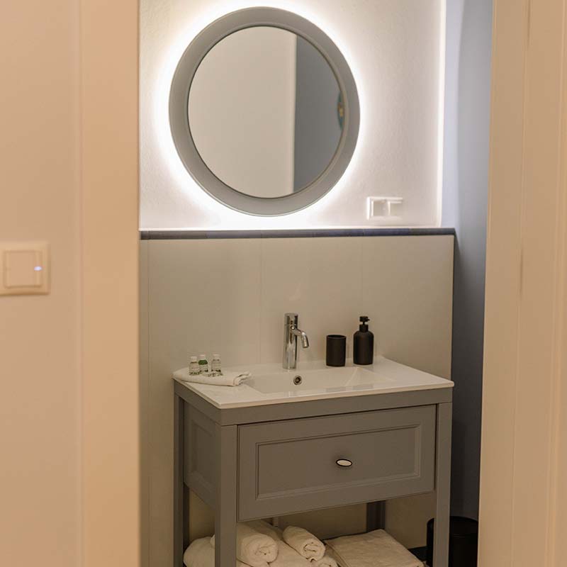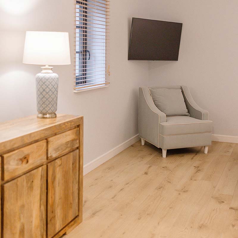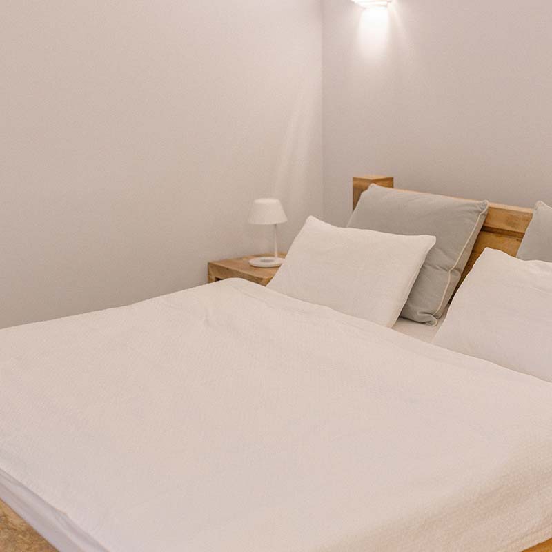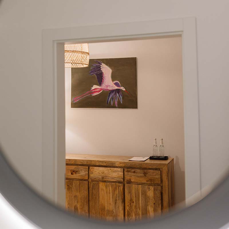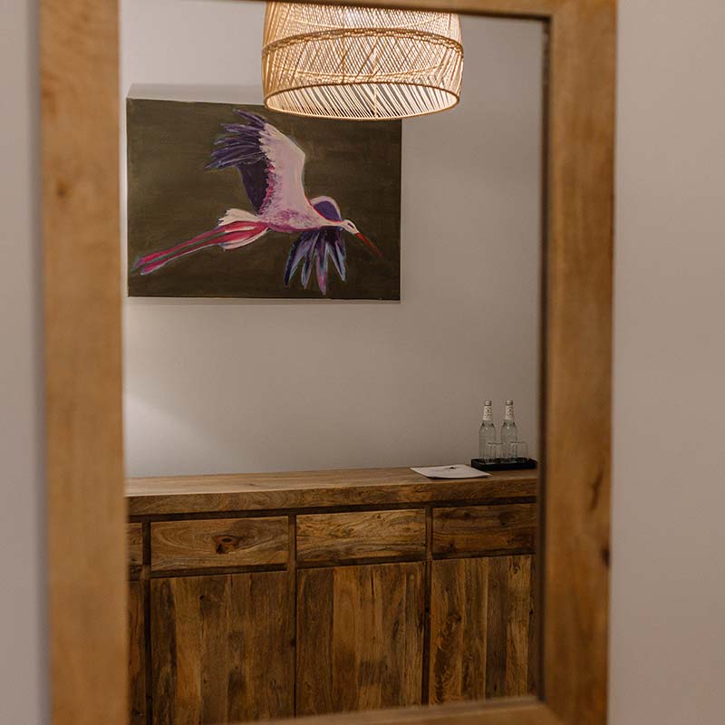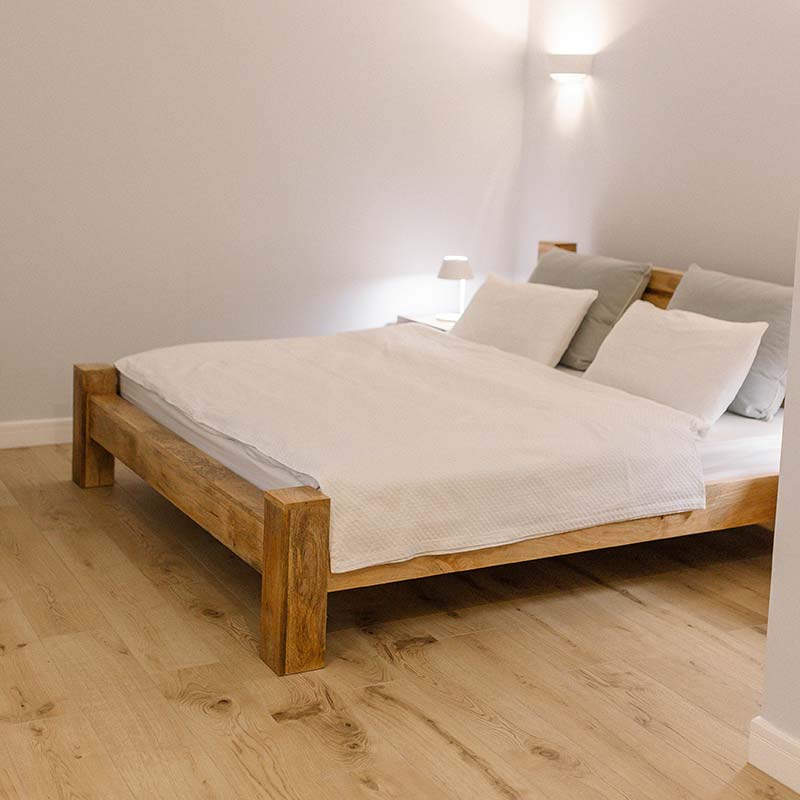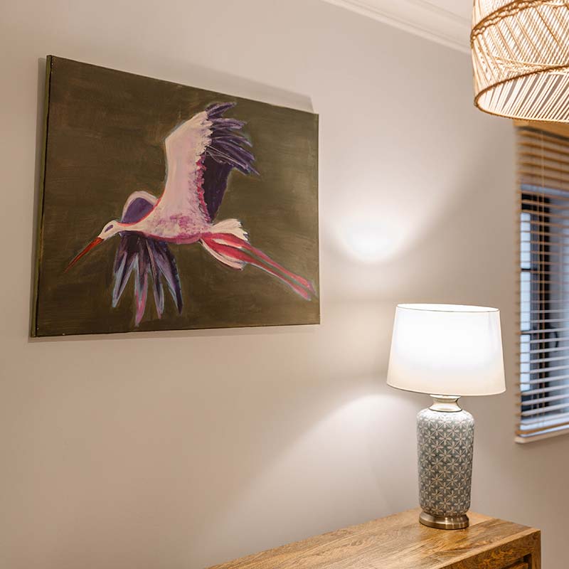 Wnętrze zachwyca jasną paletą barw, naturalnym drewnem i subtelnym oświetleniem. W sypialni – wygodne łóżko z dynamicznym obrazem ptaka w locie, który inspiruje i nadaje charakteru.